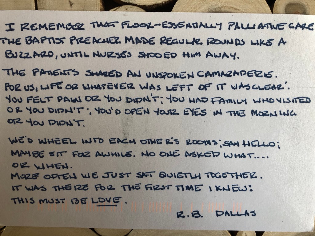 We’d wheel into each other’s rooms; say hello; maybe sit for awhile. No one asked what… or when.